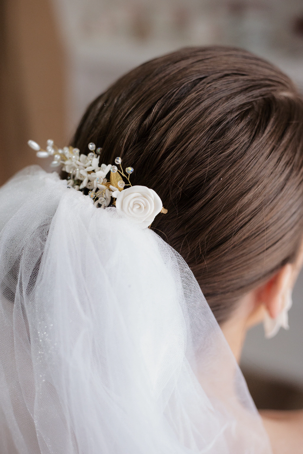 Pente em flores de porcelana fria modeladas à mão, folhas metálicas, cristais e pérolas arroz. Essa peça pode ser usada na lateral dando acabamento ao cabelo solto ou semi-preso, assim como centralizado na cabeça para finalizar um coque.